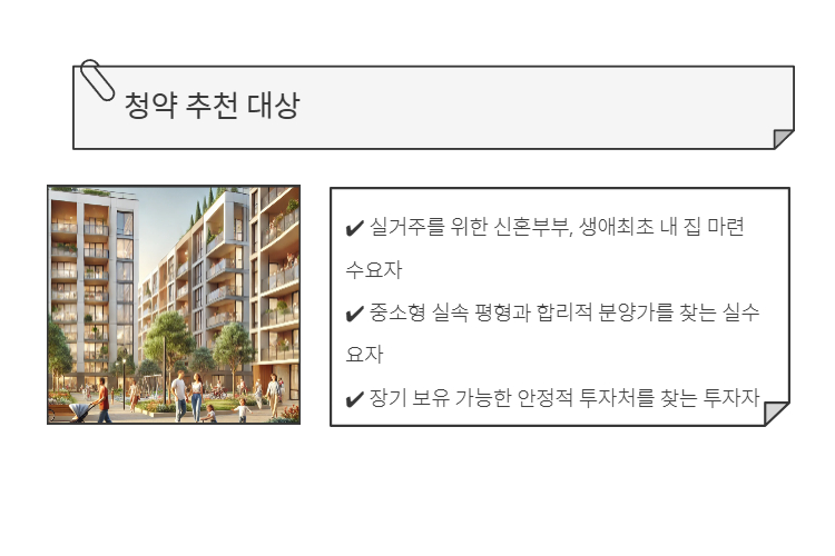 🔸 특별공급은 신혼부부, 생애최초, 다자녀, 노부모부양, 기관추천 등의 항목에 해당하는 경우 신청 가능하며, 무주택 세대 구성원이어야 합니다.