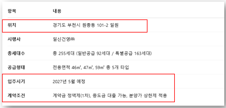 - 생활 인프라: 이마트, 오정대공원, 여월농산물도매시장, 원종초·중·고 인접