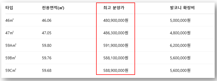 3. 원종 휴먼빌 클라츠 분양가 & 발코니 확장비