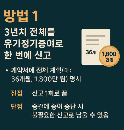 - 단점: 중간에 증여 중단 시 불필요한 신고로 남을 수 있음