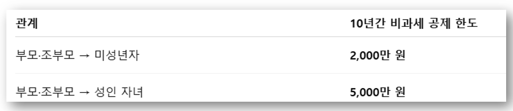 ✅ 증여세 공제 한도 (직계존속 → 자녀/손주 기준)