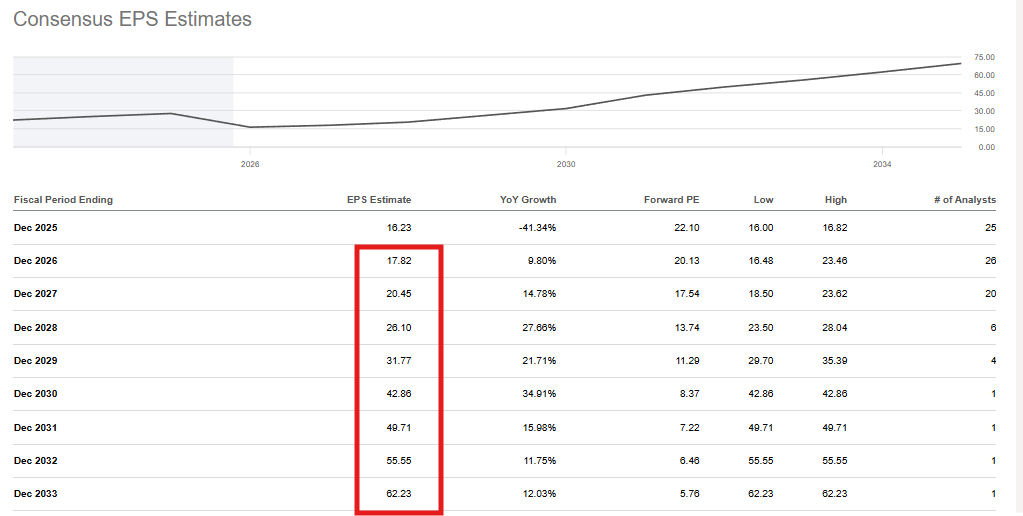 EPS 추정치를 보시면, 해마다 계속해서 성장하는 것을 볼 수 있어요! 2025년에는 성장률이 마이너스를 기록하며 주가가 많이 빠진 것으로 보이고요,