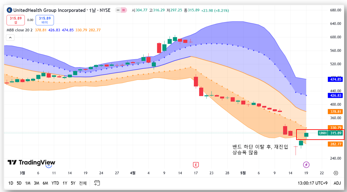 - 볼린저 밴드 하단 이탈 후 재진입 → 하락 과열 해소 신호