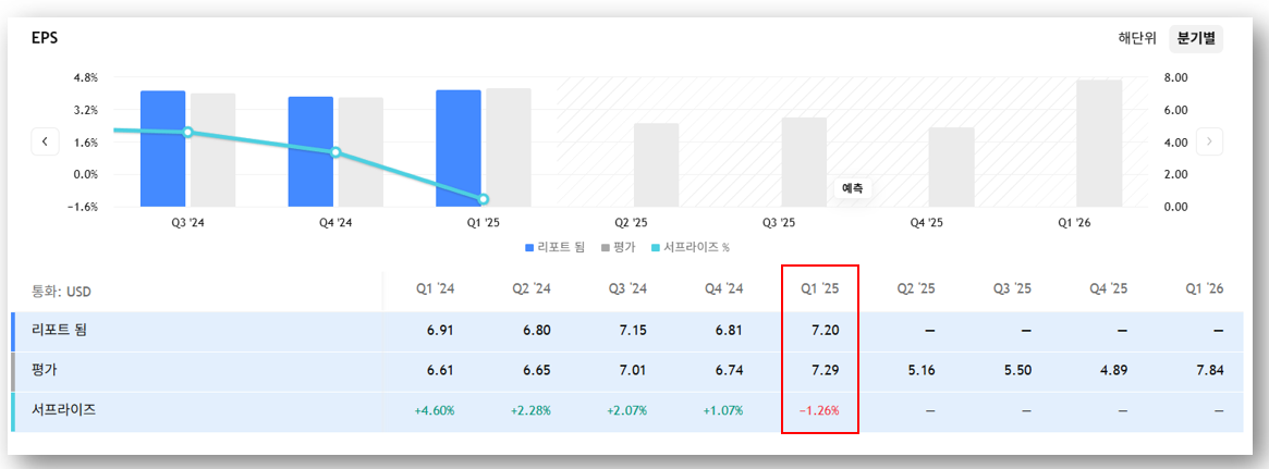 - EPS: $7.20 (예상치 $7.29 하회)