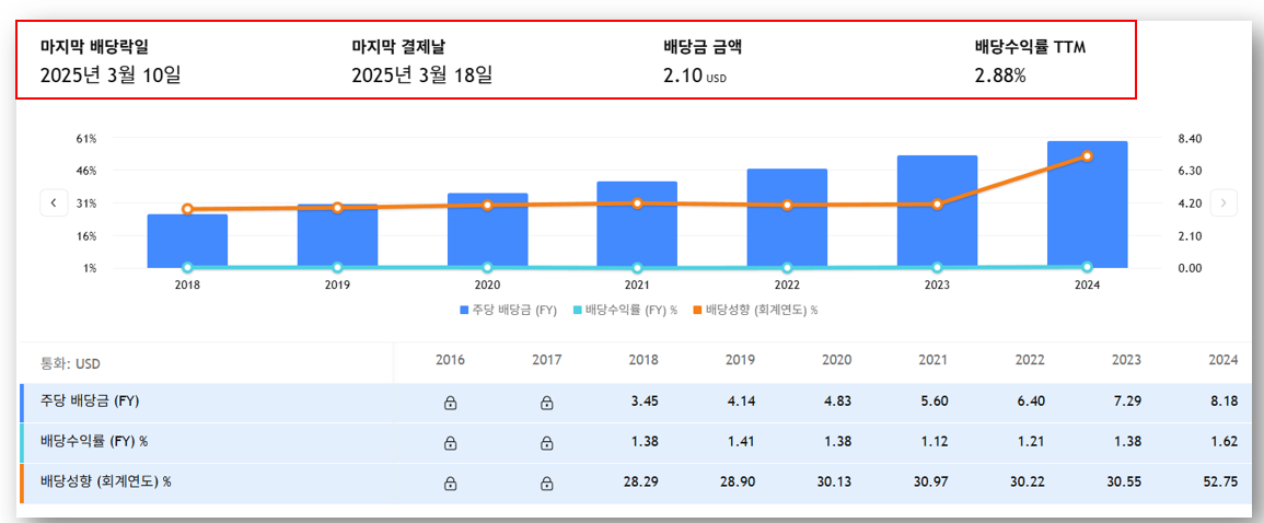 - 2024년 총 배당금 $8.18 → 2023년 대비 +12% 증가