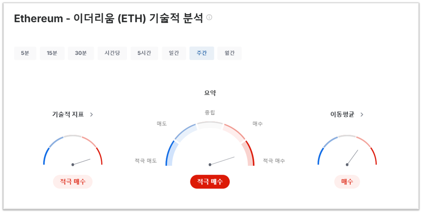 💡이더리움의 기술적 분석을 주간 데이터로 활용해서 보았을 때. 적극 매수 의견으로 나오는데요, 자세한 내용은 아래 표를 살펴보세요.