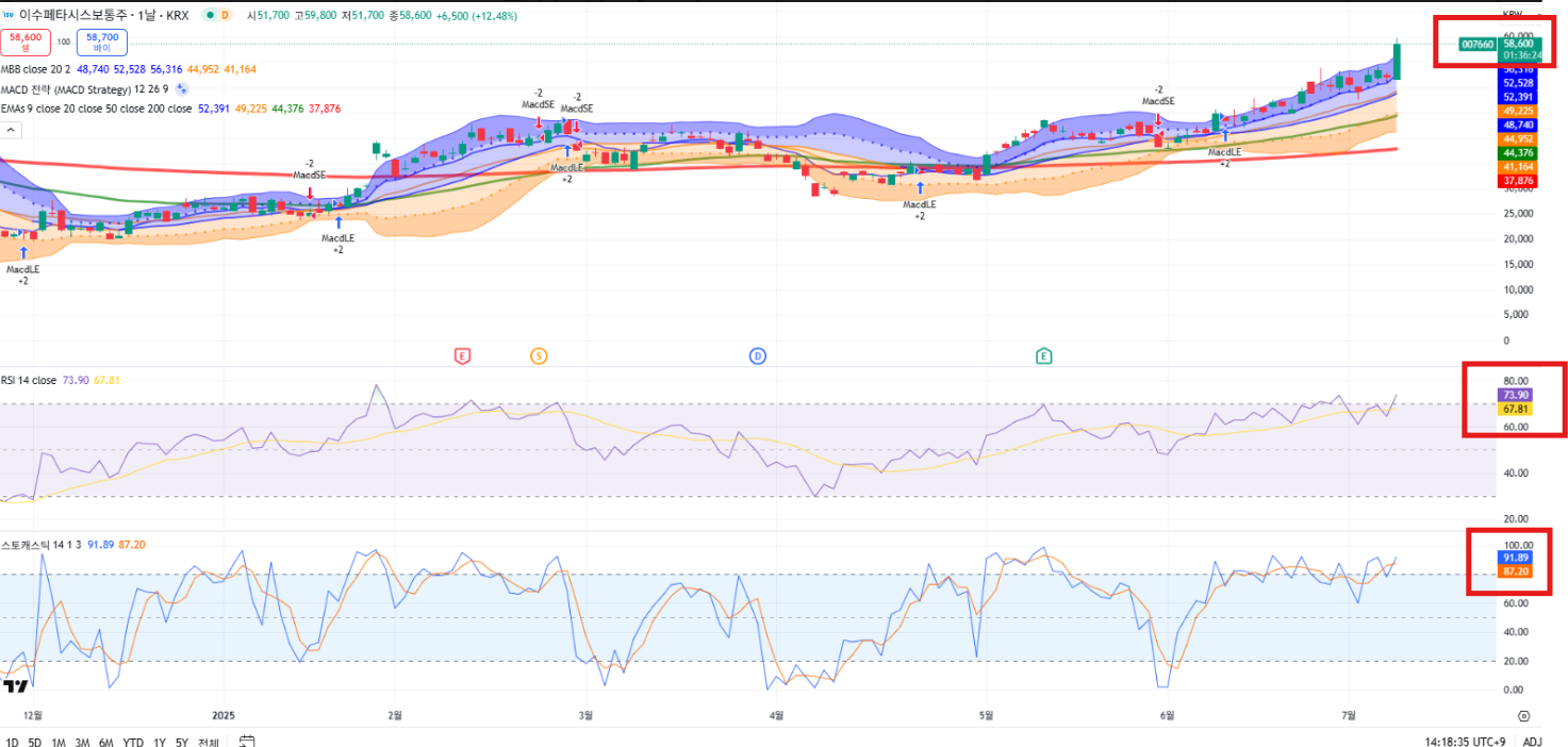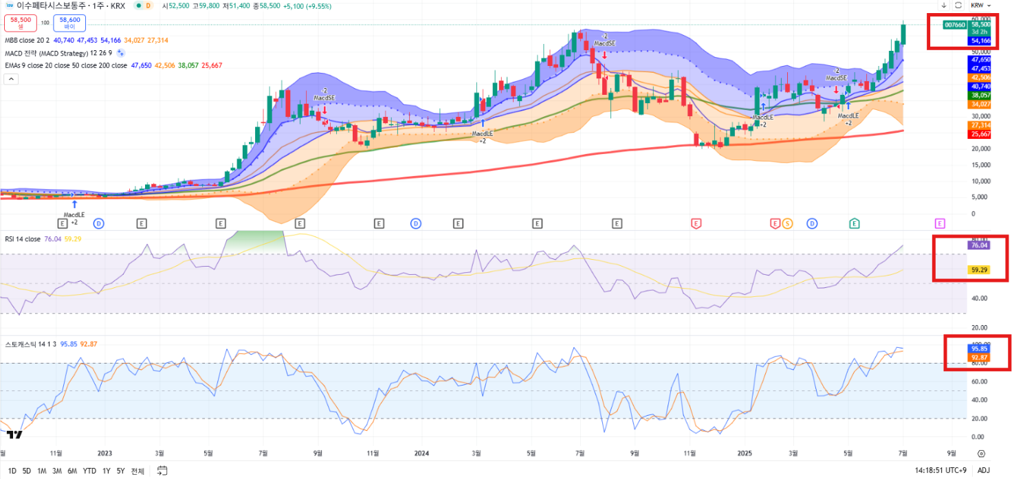 - RSI(14): 73.90 / 스토캐스틱: 91.89 → 과매수권이지만 과열보다 추세 강세 의미
