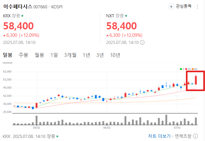 안녕하세요, 📌 2025년 7월 8일 기준, 이수페타시스(007660)는 장중 +12% 이상 급등하며 주목을 받고 있는데요,