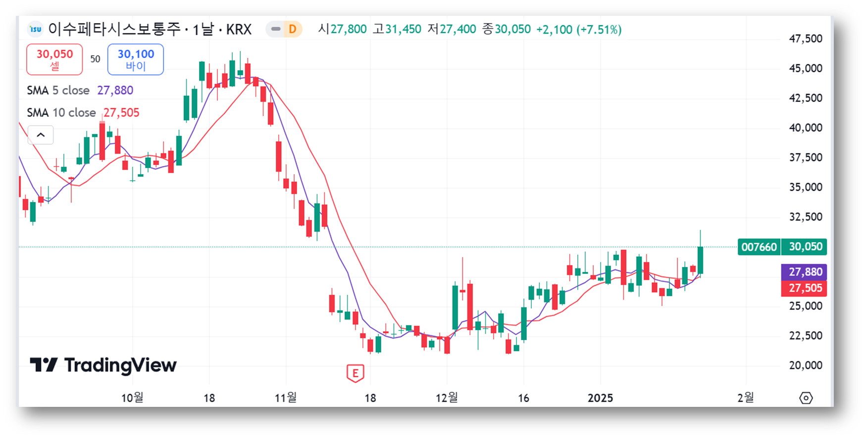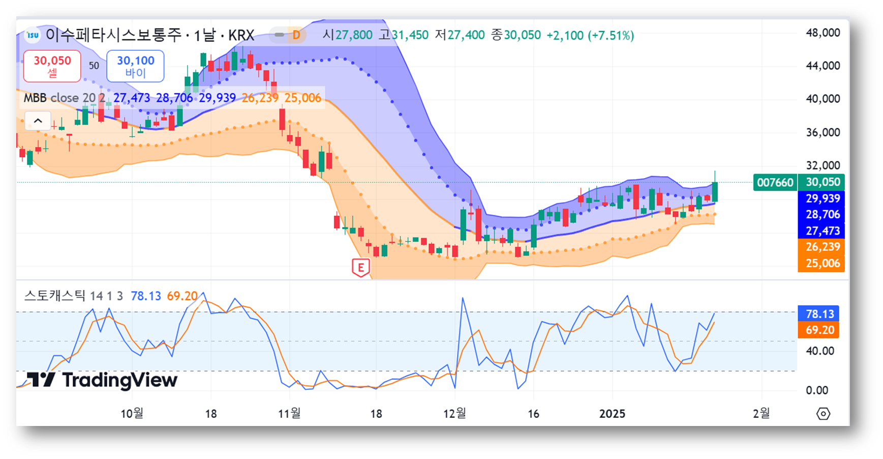 5일 이동평균선(27,880원)과 10일 이동평균선(27,505원) 위에서 주가가 안정적으로 상승하고 있으며, 단기 상승 모멘텀이 강하게 작용하고 있는 걸로 보이는데요, 최근 단기 저항선을 돌파하며 추가 상승 가능성이 있어 보입니다.