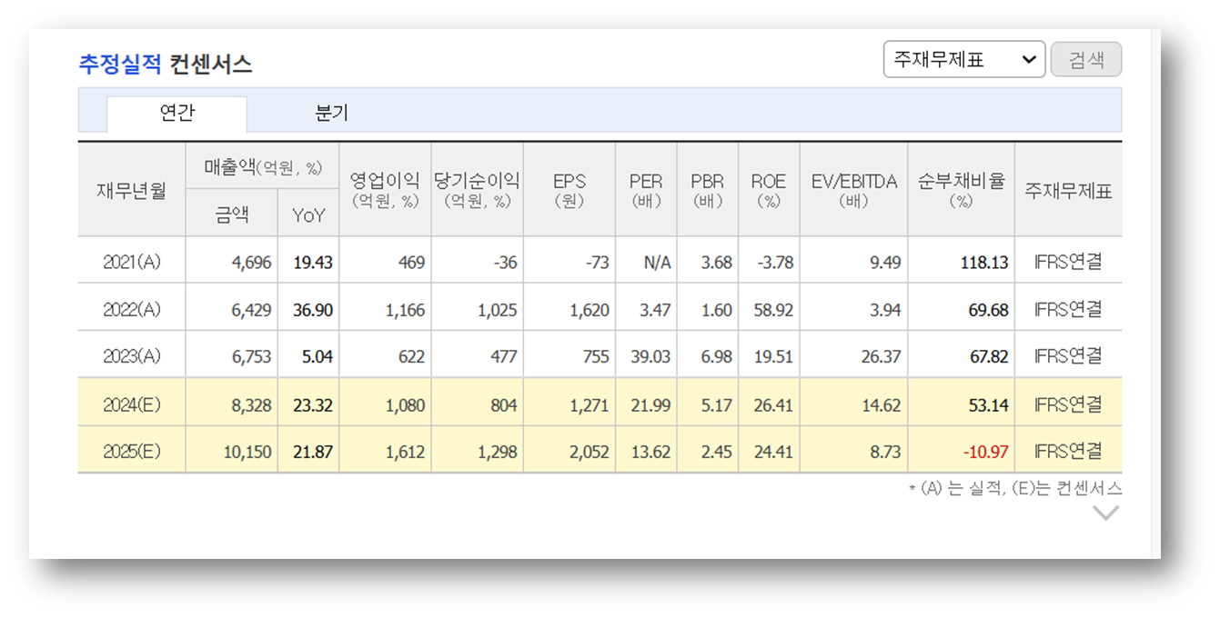 이수페타시스는 매출과 수익성이 꾸준히 증가하고 있으며, 2024년과 2025년에 각각 8,328억 원, 10,150억 원의 매출이 예상되고 있는데요, 영업이익과 당기순이익 또한 지속적으로 개선되는데요.