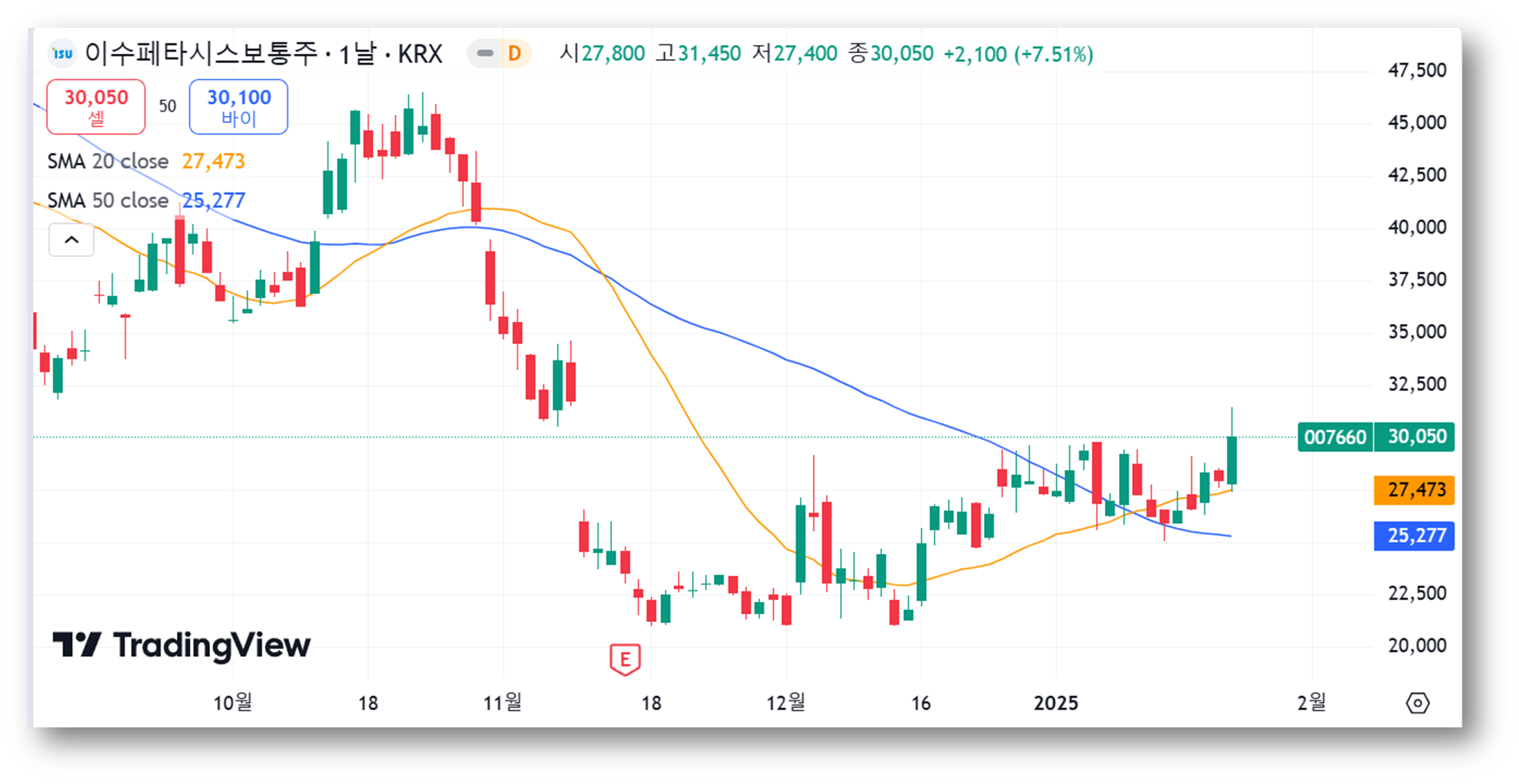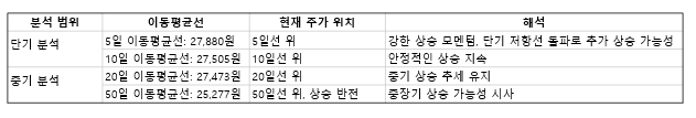 20일 이동평균선(27,473원)과 50일 이동평균선(25,277원) 위로 주가가 자리잡아 중기적인 상승 추세가 이어지고 있는데요, 특히 50일 이동평균선이 상승 반전하고 있는데, 이는 중장기 상승 가능성을 시사하고 있습니다.