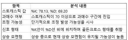 스토캐스틱이 70 이상으로 과매수 구간에 진입했는데요, 이는 주가 상승이 과열되었을 가능성을 나타내며, 단기적으로 조정이 발생할 가능성도 있다는 것을 시사하고 있습니다. 현재 %K선이 %D선 위에 위치하며 골든크로스 형태를 취하고 있으며, 상승 중이므로 현재 상승 모멘텀이 유지될 것으로 보입니다.