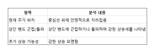 또한 밴드 폭을 보았을 때, 볼린저 밴드의 폭이 점차 확장되고 있는 모습은 변동성이 커지고 있음을 의미하며, 상승 모멘텀이 강해질 가능성이 있습니다.