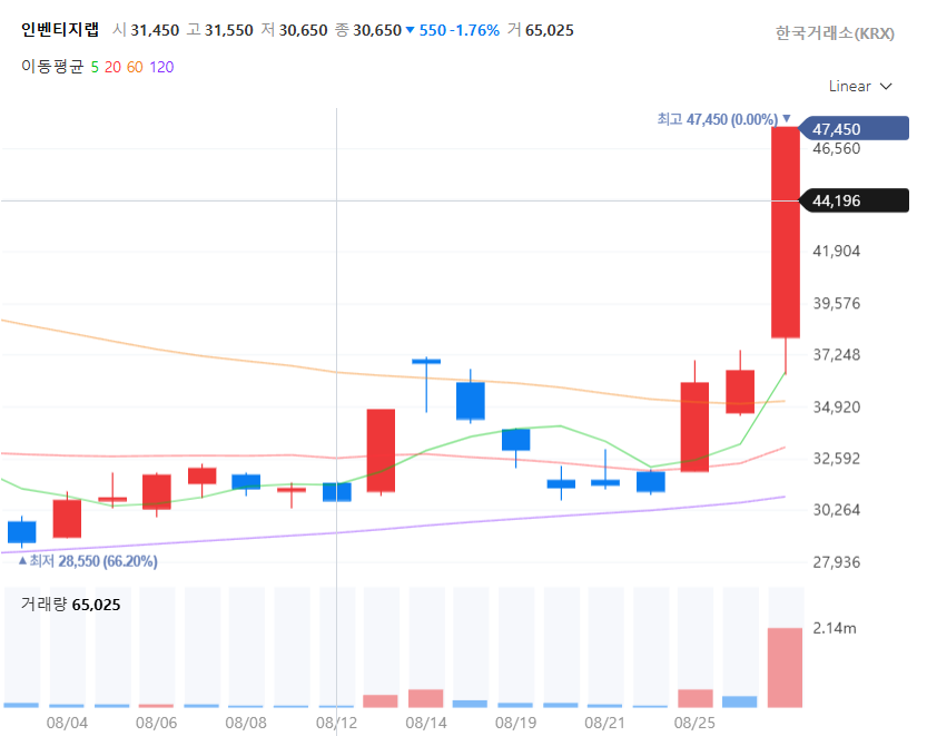 8.27 장중 47,450원을 기록하며, 전일 대비 30% 넘게 상승 중입니다. 3거래일 연속 상승 중이며, 상승 모멘텀이 매우 강해요. 주가 흐름과 주가 전망에 대해 자세히 알아보도록 하겠습니다.