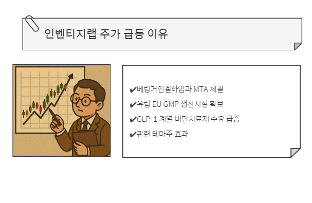 ✍️ 정리: 인벤티지랩 주가 급등 이유는 베링거인겔하임과의 MTA 체결 + 유럽 생산기지 확보 + GLP-1 시장 성장성 때문이며, 중장기적으로는 글로벌 상업화 성공 여부가 관건입니다.