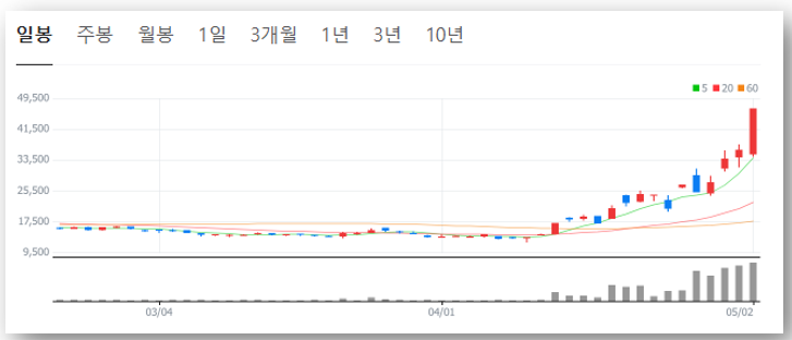 👉 주가가 1주일 새 2만 원대 → 4만 원대 중반으로 폭등하며, 투자자 관심이 집중되고 있습니다.