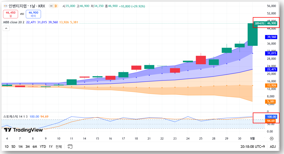 - 스토캐스틱 지표: 현재 100(완전 과매수 구간) → 단기 급등에 따른 조정 가능성 있음
