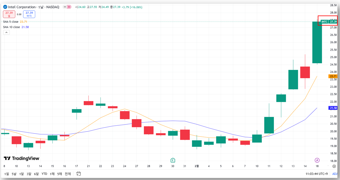 최근 인텔(INTC, NASDAQ: INTC) 주가가 하루 만에 +16.06% 급등하며 27.39달러에 마감했는데요, 왜 주가가 상승했는지 그 이유와 향후 주가 전망과 목표 주가에 대해 알아보도록 하겠습니다.