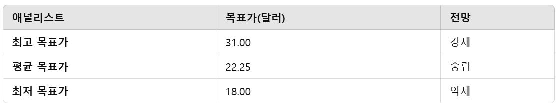 현재 애널리스트들의 평균 목표가는 22.25달러로 현재 주가보다 낮은 수준이지만, 일부 기관에서는 최대 31달러까지 상승 가능성을 제시하고 있다.