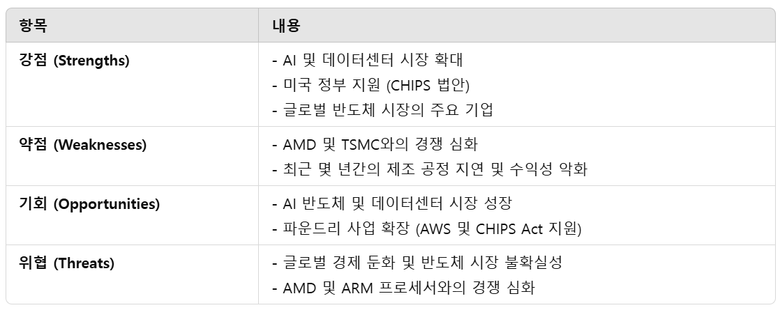 인텔의 SWOT을 자세히 살펴보겠습니다.