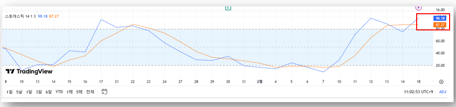 ② 스토캐스틱 지표: 과매수 구간 진입 (98.18, 87.27)