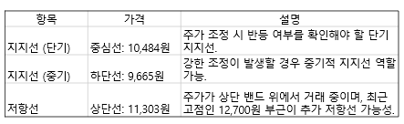 - 지지선: 중심선(10,484원) 부근이 단기적인 지지선으로 작용할 가능성이 높습니다. 주가가 조정되더라도 이 선에서 반등 가능성을 확인할 필요가 있습니다. 만약 주가가 강하게 조정된다면, 하단선 (9,665원) 부근이 중기적인 지지선 역할을 할 수 있습니다.