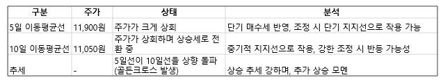 주가는 10일 이동평균선도 상향 돌파했으며, 10일 이동평균선 역시 상승세로 전환 중인데요, 10일 이동평균선(11,050원 근처)은 중기적 지지선으로 작용할 가능성이 큽니다. 강한 조정이 발생하더라도 이 선에서 지지가 이루어진다면 다시 상승세를 이어갈 수 있습니다.