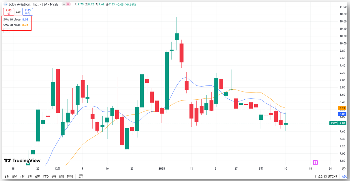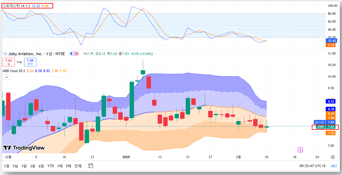 현재 JOBY 주가는 7.83달러이며, 볼린저 밴드 하단(7.55달러) 근처에서 횡보하고 있습니다.