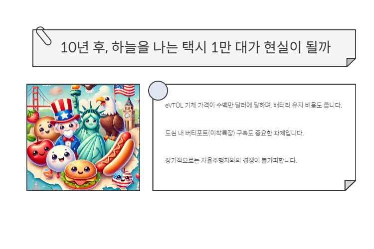 • eVTOL 기체 가격이 수백만 달러에 달하며, 배터리 유지 비용도 크기 때문입니다.