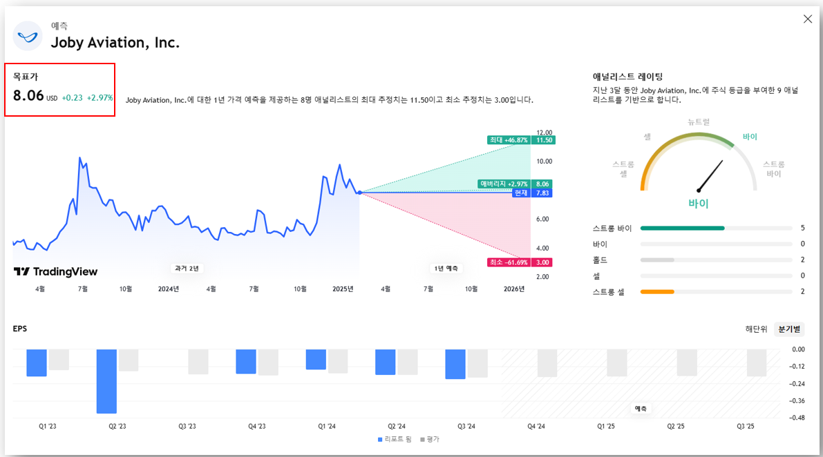 최근 Joby Aviation (NYSE: JOBY)의 주가는 7.83달러로 거래되며, 전날 대비 0.64% 상승했는데요, 전기 수직 이착륙(eVTOL) 항공기를 개발하며 도심 항공 모빌리티(UAM) 시장을 선도하고 있습니다. 하지만 현재는 수익을 창출하지 못하고 있으며, 재무적으로 적자를 지속하고 있는 상황인데요, 미래의 성장 가능성이 기대되는 조비 에비에이션의 주가 전망 및 목표 주가에 대해 자세히 알아보도록 하겠습니다.