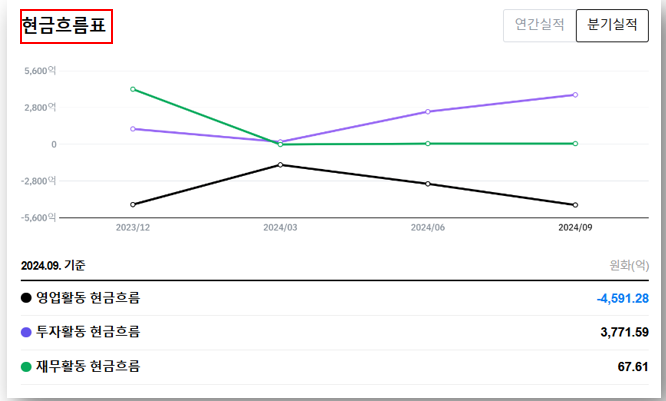 • 영업활동 현금흐름: -4,589억 원 (지속적 현금 유출)
