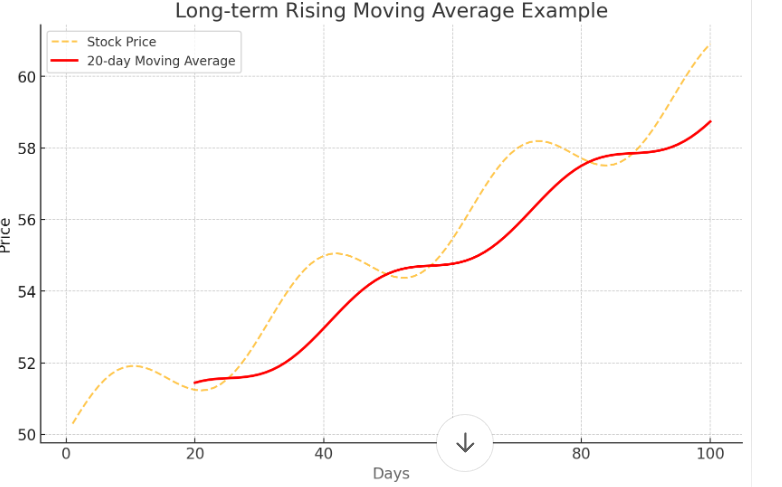 위에 보이는 그래프는 장기적인 상승을 나타내는 이동평균선의 예시인데요, 빨간색 선은 20 일 이동평균선을 나타내며, 주가의 전체적인 상승의 흐름을 포착할 수 있습니다.