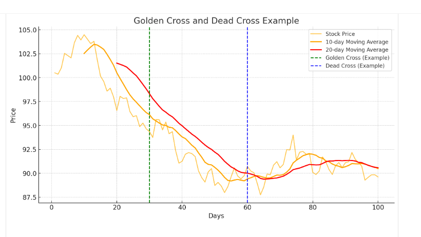 ✅ 데드크로스 (파란색 점선) : 단기 이동평균선이 장기 이동평균선을 위에서 아래로 교차할 때 발생하며, 주가 하락의 신호로 볼 수 있습니다.