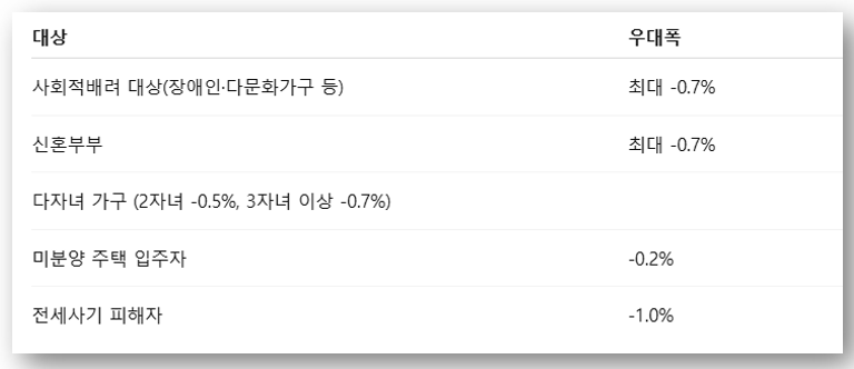 📝 신혼부부(7년 이내), 다자녀 가구, 생애최초 구입자는 별도 우대금리 적용 가능