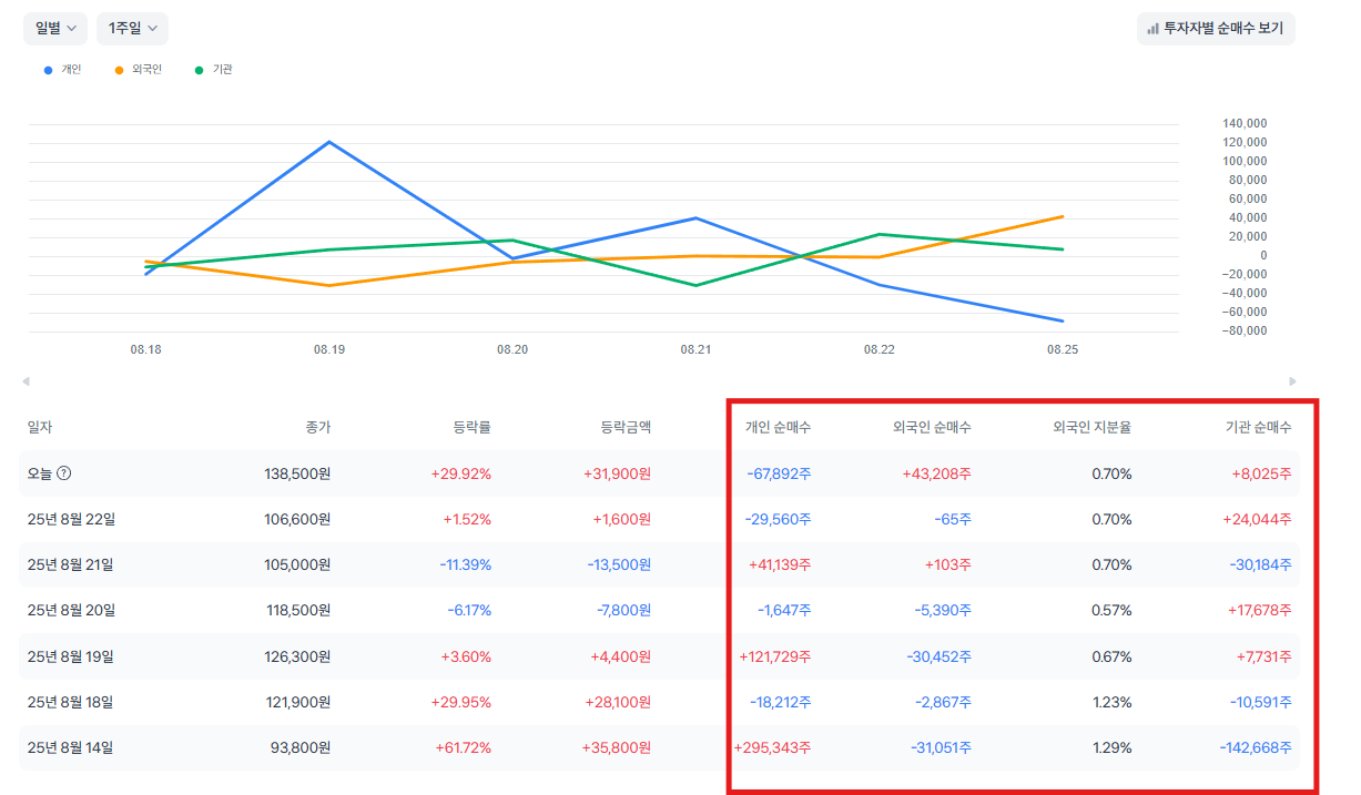 • 8월 25일 종가: 138,500원 (+29.92%)