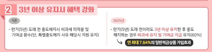 - 3년 이상 유지하면 중도 해지 시에도 60% 기여금 환급 + 이자 비과세 유지