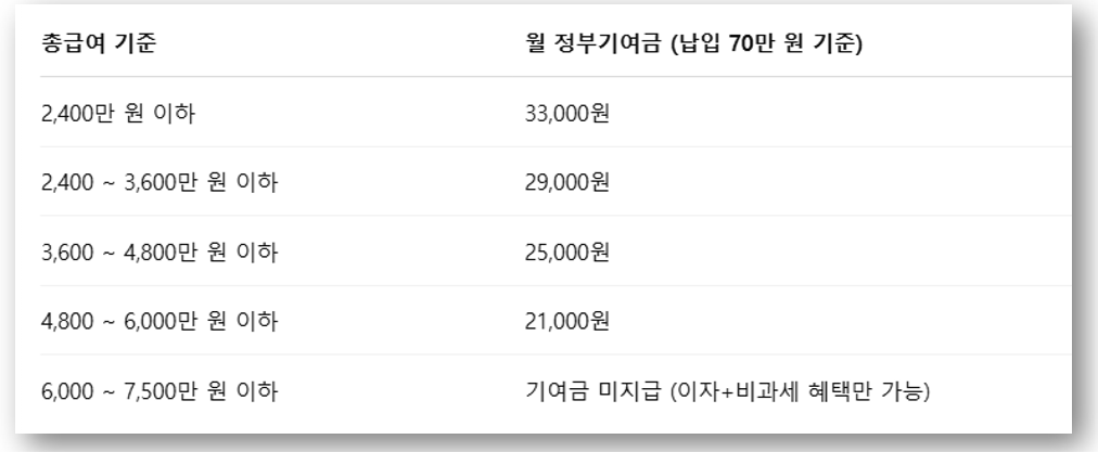 정부기여금은 개인 소득 수준에 따라 차등 지급됩니다.