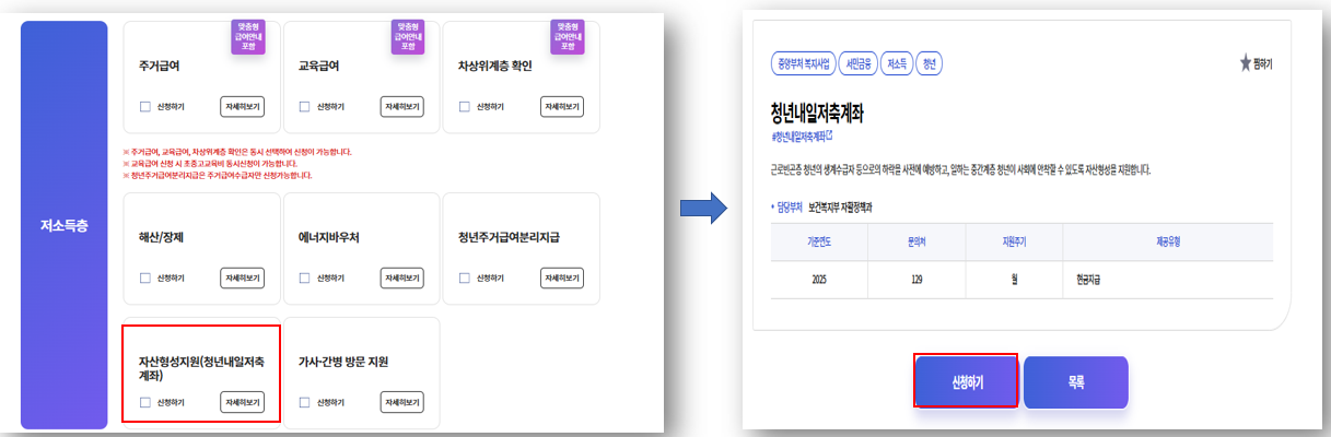 - [서비스 신청] → [복지급여 신청] → [저소득층] → [자산형성지원(청년내일저축계좌)]