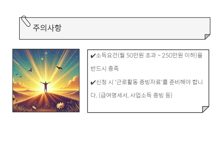 - 신청 시 '근로활동 증빙자료'를 준비해야 합니다. (급여명세서, 사업소득 증빙 등)