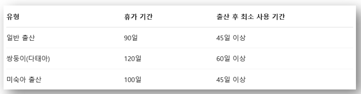 ※ 출산 후 최소 45일 이상은 반드시 보장되어야 하며, 전체 휴가는 연속 사용이 원칙입니다.