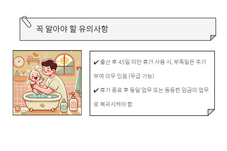 - 출산 후 45일 미만 휴가 사용 시, 부족일은 추가 부여 의무 있음 (무급 가능)