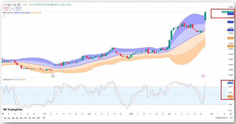 - 스토캐스틱 지표(14,3,3) 기준 93.33으로 과매수 구간 진입, 추가 상승 가능성 시사