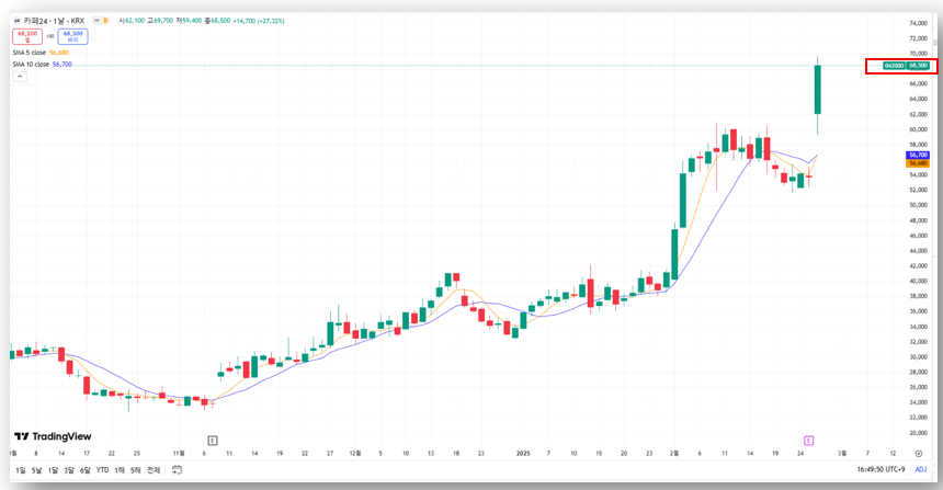 카페24 주가가 급등하면서 투자자들의 관심이 집중되고 있는데요, 2월 26일 기준, 카페24 주가는 68,500원(+27.32%)으로 마감하며 단 하루 만에 27% 이상 급등했습니다. 이번 급등의 배경은 무엇인지, 카페24의 주가 전망과 주가 상승 이유, 그리고 목표 주가까지 자세히 알아보도록 하겠습니다.