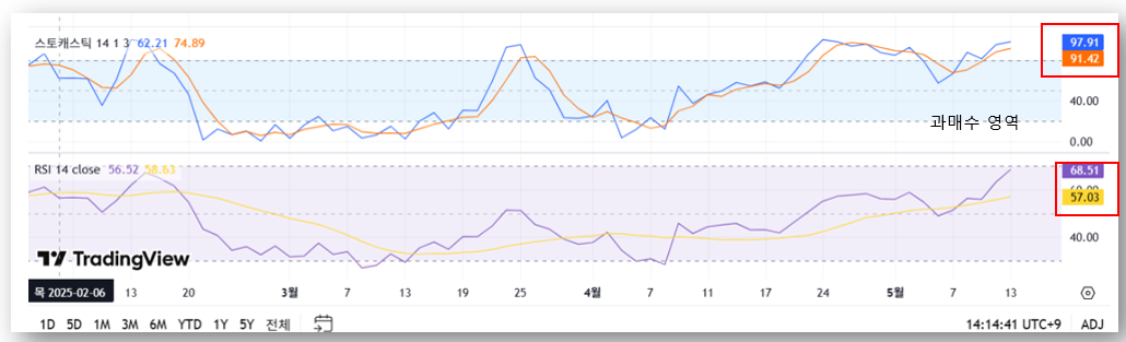 • 과매수 구간 진입 중으로 분할 매수 또는 눌림목 매수 전략 추천