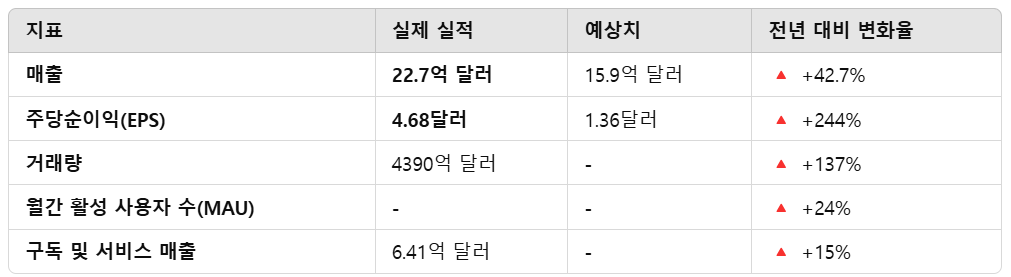 - 암호화폐 거래량 증가 → 시장 활황 시 강한 수익 성장