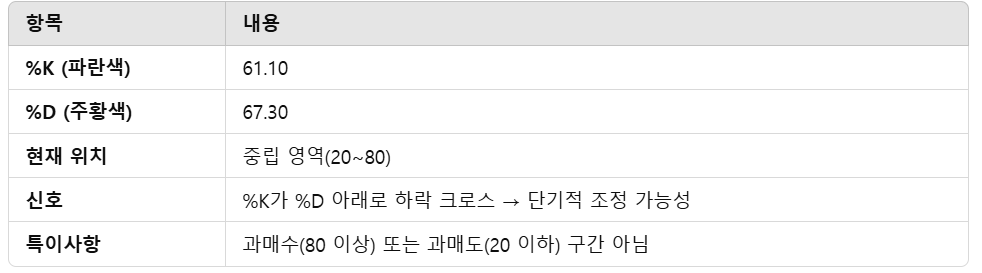 - %K가 %D 아래로 내려가며 하락 크로스 형태를 보이고 있어, 단기적 조정 가능성이 있음.