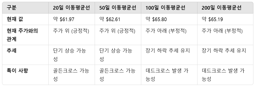 - 현재 주가: $62.83 (20일 및 50일 이동평균선 위)