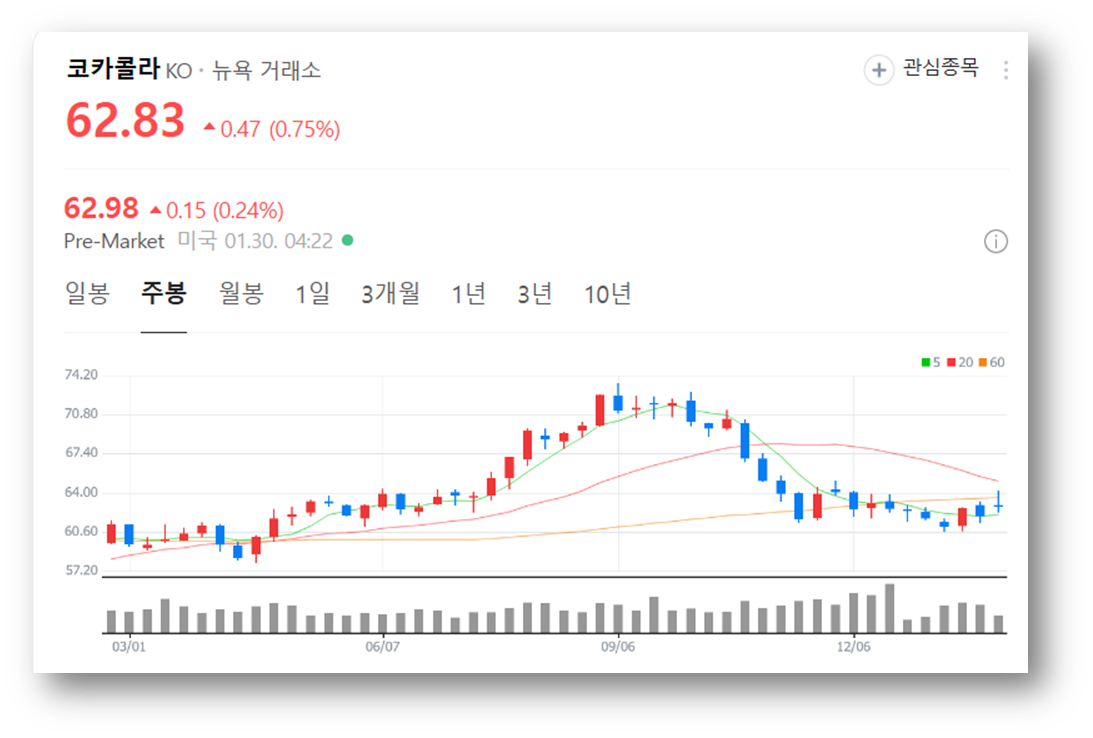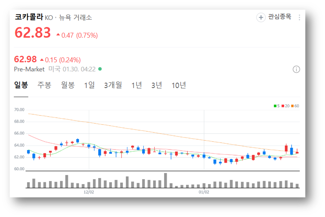 - 배당금: $1.94 (수익률 3.1%) 👉배당금을 중시하는 장기 투자자에게 좋은 종목으로 보여집니다.