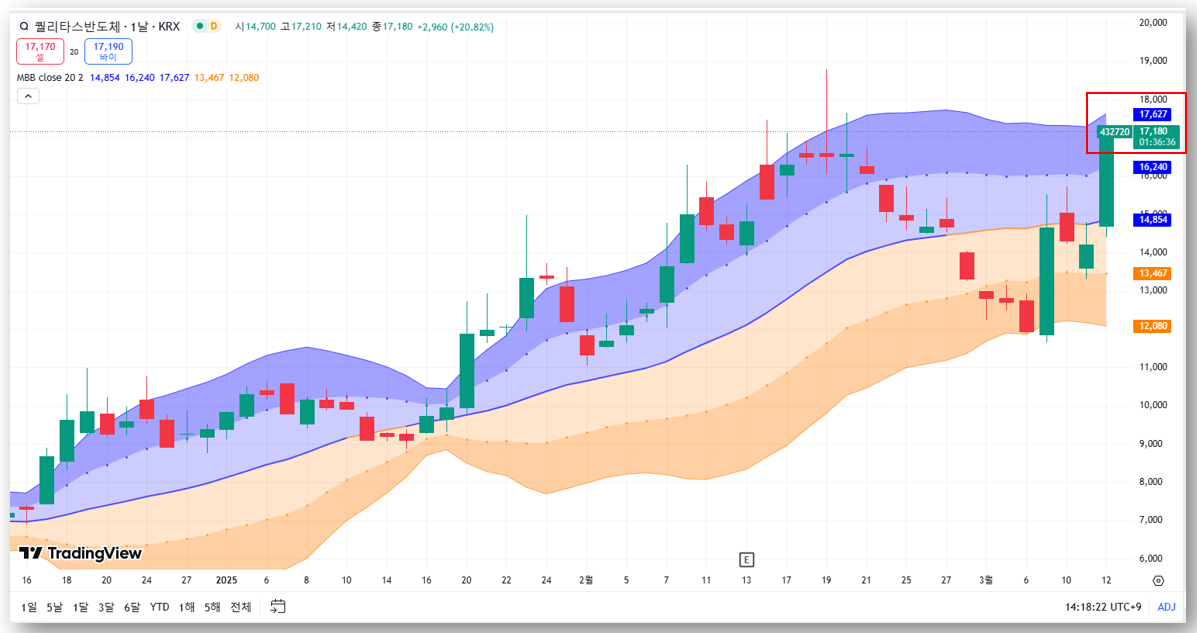 📌 볼린저밴드 상단(17,627원) 도달 후 조정 가능성 존재