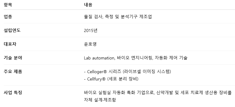 큐리오시스는 바이오 실험실 자동화에 특화된 기업으로, 신약개발과 세포 치료제 생산에 필수적인 이미징·분석·분리 장비를 자체 설계 및 제조하는 역량을 보유하고 있습니다.